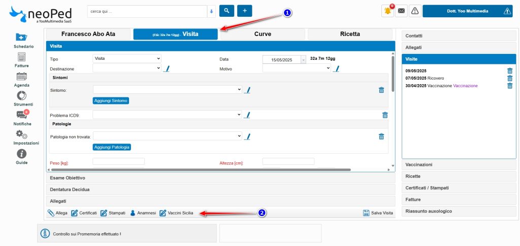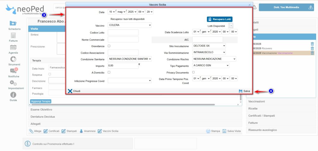 Nella regione Sicilia, un medico che deve inoculare un vaccino a uno dei suoi pazienti, deve andare alla sezione di neoPed denominata “Schedario”, selezionare il nome del paziente e cliccare sulla voce in basso, denominata “Vaccini Sicilia”. Così facendo, si aprirà una finestra, nella quale compariranno la data del giorno e si avrà la possibilità di recuperare i lotti di vaccino disponibili, sulla base della patologia per cui il professionista ha scelto di effettuare un determinato vaccino a un determinato paziente. Nella parte sinistra della finestra aperta, il medico potrà quindi indicare il tipo di vaccino da inoculare; se la paziente è una donna, il dottore potrà specificare se è in stato di gravidanza; in base al paziente selezionato, il professionista potrà precisare la sua condizione sanitaria. E, ancora, il sanitario potrà spuntare la voce “A domicilio”, qualora il vaccino venga effettuato nell’abitazione del paziente. Infine, il medico potrà dichiarare se il paziente abbia contratto il Covid oppure no. Nella parte destra della finestra aperta, invece, il dottore usufruirà del database di neoPed, tramite il quale “Recuperare i Lotti” di vaccino disponibili, la loro data di scadenza e la loro autorizzazione all’immissione in commercio (AIC). A conclusione delle informazioni necessarie per la completa registrazione del vaccino da inoculare, il professionista potrà illustrare il “Sito di Inoculazione”, la “Via di Somministrazione” e l’eventuale “Condizione di Rischio” del paziente. Una volta effettuati tutti questi passaggi, sarà sufficiente cliccare su “Salva” per aggiornare la cartella clinica digitale.